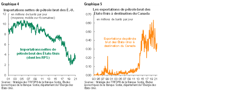 i) La variable factice du pétrole brut WTI (2000-2013 = 0; depuis 2014 = 1). Nous constatons que la sensibilité du taux de change aux cours du pétrole baisse à partir des alentours de 2014; elle paraît réagir à un décalage par rapport à l’accroissement de la production du pétrole brut aux États-Unis (soit essentiellement le pétrole de schiste). Si le déficit pétrolier des États-Unis par rapport au Canada a continué de se creuser, l’important déficit du brut américain s’est considérablement amenuisé (graphique 4; graphique 5 pour les exportations américaines à destination du Canada) —, ce qui vient réduire l’impact multilatéral de la hausse des cours du brut sur le dollar US. À terme, nous croyons que l’intensification des efforts d’électrification des véhicules et de verdissement de l’énergie donnera probablement lieu à une moins grande dépendance vis-à-vis du pétrole et, par conséquent, à une baisse de la sensibilité du dollar US aux cours du pétrole. De même, le secteur canadien de l’énergie représente depuis une part plus modeste de l’économie du pays, de sorte que les fluctuations des cours du pétrole ont de moindres retentissements sur les actifs canadiens.