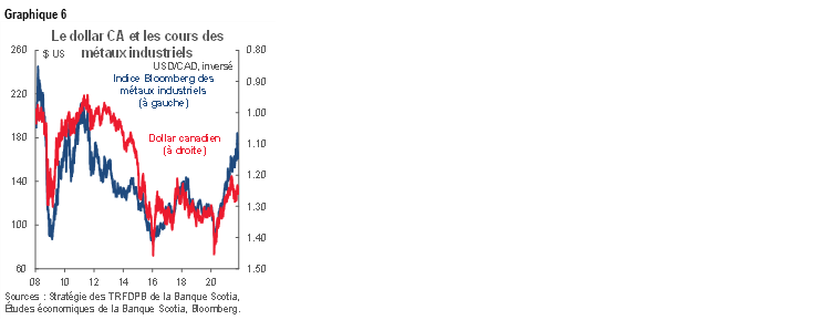 b) L’indice Bloomberg des métaux industriels (graphique 6). Cet indice panier pondéré, qui regroupe le cuivre, l’aluminium, le zinc et le nickel, est intégré en raison de l’excédent commercial du Canada avec les États-Unis dans les métaux industriels; la justification est la même que pour l’intégration des cours du pétrole brut.