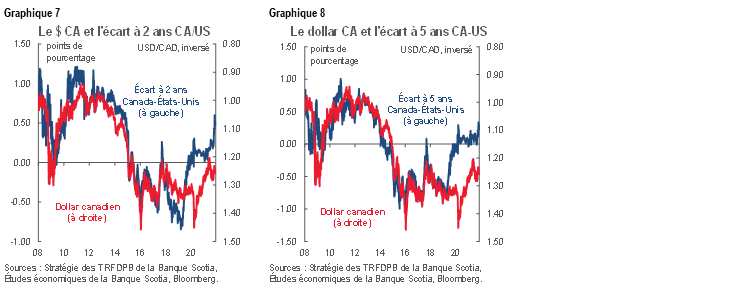 a) Les différentiels de rendement entre le Canada et les États-Unis à 2 ans et 5 ans (graphiques 7 et 8). La hausse des rendements canadiens par rapport aux rendements américains a pour effet d’accroître la demande exprimée pour le dollar CA à l’heure où les investisseurs recherchent de meilleurs rendements sur les actifs canadiens (en données constantes). Nous tenons compte des écarts à 2 ans et à 5 ans à la fois pour faire la distinction entre l’horizon d’investissement à plus court terme et l’horizon d’investissement à plus long terme. (Il faut noter que les écarts sur 10 ans sont statistiquement moins importants, par comparaison.) L’horizon à plus court terme pourrait servir à rendre fidèlement compte des attentes vis-à-vis du taux directeur à court terme, alors qu’à plus long terme correspond aux attentes vis-à-vis de la rapidité avec laquelle les banques centrales haussent les taux les unes par rapport aux autres. Une spécification qui exclut les résultats des écarts à 2 ans ou à 5 ans donne lieu à une moins grande complémentarité sur notre horizon d’estimation.