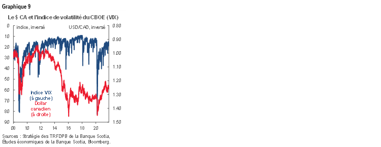 - Selon le modèle de basculement du régime, les échanges du dollar CA cadrent actuellement avec ses grands déterminants. La monnaie a, à une époque très récente, dévié de ses facteurs essentiels pendant le choc de la COVID-19 en mars 2020 : la volatilité des marchés a alors culminé à son plus haut depuis octobre 2008. Avant la période de tumulte des marchés l’an dernier, ce modèle de basculement du régime n’avait pas permis de constater de déviation importante du dollar CA par rapport à ses facteurs essentiels depuis le début de 2017, soit à peu près à l’époque où le président Trump est entré en fonction.