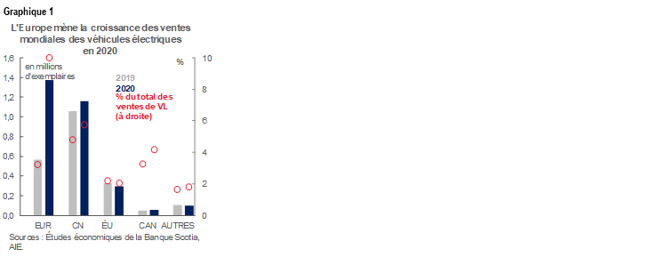 Malgré l’incertitude qui pèse sur les perspectives à court terme dans les ventes d’automobiles, on peut dire que les perspectives à moyen terme pour les ventes de véhicules électriques (VE) apportent un meilleur éclairage. Les ventes mondiales de véhicules électriques ont décollé pendant la pandémie. En 2020, les ventes totales de VE ont gagné 43 % sur un an (pour s’établir à 3 millions d’exemplaires), alors que toutes les ventes de véhicules légers ont perdu 16 %. Le parc mondial de VE s’établit désormais à plus de 10 millions d’exemplaires (soit 1 % du parc total de véhicules légers), alors que les ventes de VE neufs représentent près de 5 % des ventes mondiales de véhicules légers. En Europe, les ventes de VE ont plus que doublé pour s’inscrire à 1,4 million d’exemplaires en 2020, ce qui dépasse les achats chinois à 1,2 million d’exemplaires (12 % sur un an). Les États-Unis ont été à peine dans la course, avec des ventes de moins de 300 000 VE en 2020 (graphique 1).