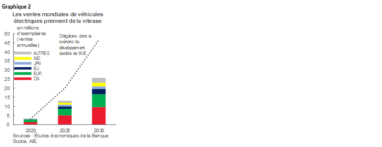 Différents facteurs expliquent la demande mondiale de VE. Les politiques généralisées sous-tendent la reprise portée par les consommateurs, qui fait rejaillir des bienfaits sur la plupart des biens durables, dont les ventes de véhicules. En outre, les effets de la richesse ont aussi probablement musclé les ventes de VE, dont les prix ont tendance à être plus élevés que ceux des modèles traditionnels à moteur à combustion interne. Les incitatifs ciblés à l’achat des VE se sont eux aussi relevés substantiellement (+25 % sur un an selon l’Agence internationale de l’énergie — AIE) pendant la pandémie, surtout dans les grands marchés européens comme l’Allemagne. Dans le même temps, la plus vaste sélection de modèles a aussi sous-tendu mondialement la vigueur des ventes de VE.