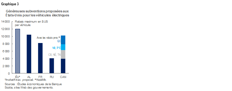 Surtout, les États-Unis prévoient d’investir vraiment dans cette course. Dans l’American Jobs Plan, déposé auparavant cette année, on consacre 174 milliards de dollars US au développement du marché intérieur des VE, notamment grâce à des incitatifs à l’achat et aux infrastructures de recharge. Les incitatifs à l’achat pourraient représenter 12 500 $ US par véhicule dans le cadre de ce plan — si le projet de loi budgétaire est adopté — en tenant compte du financement complémentaire pour les véhicules construits aux États-Unis et protégés par les syndicats. Ces mesures seraient supérieures aux mesures adoptées sur les marchés européens déjà généreux, de même qu’au Canada — mais dans une moins grande mesure, selon la province dans laquelle on achète le véhicule (graphique 3).