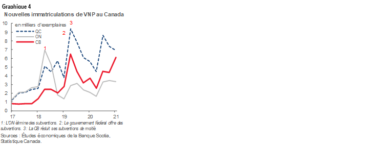 En deçà de nos frontières, le paysage fragmenté et fluctuant des incitatifs prévus dans les politiques d’un océan à l’autre vient aussi fausser le portrait. À l’évidence, les programmes de dépenses incitatives du gouvernement fédéral et des provinces portent la différenciation (graphique 4). Dans toutes les régions, on a constaté qu’il s’agissait d’une bénédiction pour les ventes quand le gouvernement fédéral a lancé, au printemps 2019, les incitatifs à l’achat des VE. Dans le même temps, le Québec domine le marché national du point de vue du volume, grâce à de meilleures subventions provinciales, de concert avec les contrats de vente. La Colombie-Britannique joue dans la cour des grands; toutefois, dans cette province, les ventes se sont repliées pour un temps quand les incitatifs offerts par le gouvernement ont été coupés de moitié en juin 2019. Le marché de l’Ontario est toujours plongé dans la torpeur, depuis que le gouvernement a mis fin à son programme d’incitatifs en 2018.
