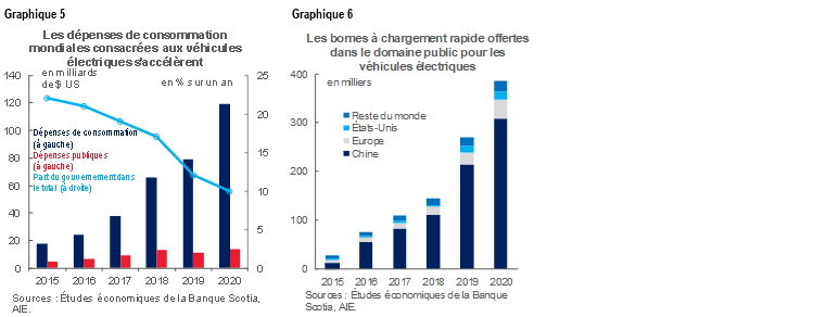 Le prix n’est qu’un obstacle quand il s’agit de relever l’adoption des VE. En fait, les dépenses de consommation s’accélèrent à une allure beaucoup plus vive que les subventions de l’État pour les achats de VE, ce qui a fait baisser la part de l’aide gouvernementale (graphique 5). De sondage en sondage, on apprend que l’anxiété (ou l’accès à des infrastructures de recharge rapide) est l’un des grands obstacles qui se dressent contre la hausse des ventes de VE; c’est entre autres ce que nous révèle un sondage récent de l’Association canadienne des constructeurs de véhicules (ACCV). Ce même sondage attire l’attention sur les distinctions entre les automobilistes du secteur urbain et ceux du secteur rural, ce qui représente une considération très importante pour les pays géographiquement vastes comme le Canada et les États-Unis. Il n’empêche que l’aménagement proposé d’un autre demi-million de bornes de recharge aux États-Unis pourrait très bien permettre de corriger les déficits actuels par rapport aux autres marchés plus évolués à cet égard (graphique 6).