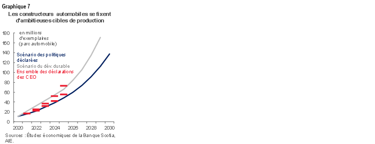 On peut dire que le président Biden est en train de faire du rattrapage avec les constructeurs automobiles eux-mêmes. L’AIE affirme que 18 des 20 premiers constructeurs automobiles mondiaux ont des plans affirmés pour élargir la gamme des modèles de VE et pour en relever rapidement la production. À court terme (soit en 2021-2022), les plans de production des constructeurs de l’équipement d’origine cadrent essentiellement avec le déploiement, selon l’AIE, des plans des politiques déclarées de l’État du point de vue des ventes mondiales de VE. D’ici 2025, les plans de production de VE selon les déclarations des constructeurs de l’équipement d’origine dépasseraient les ambitions actuelles exprimées dans les politiques (avant de prendre en compte le nouveau décret en vigueur aux États-Unis), ce qui rapprocherait la trajectoire des ventes du « scénario de développement durable », soit le scénario qu’il faudrait réaliser pour atteindre les cibles nettes de zéro d’ici 2050 (graphique 7).