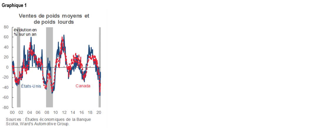 Dans une activité fortement cyclique, ces chiffres sont comparables — sans toutefois les surpasser — aux reculs inscrits dans les précédentes périodes de récession. Par exemple, les ventes avaient perdu respectivement -33 % sur un an et -40 % sur un an aux États-Unis et au Canada en 2009, au pic de la crise financière mondiale. Durant cette période, les baisses mensuelles ont frôlé -50 % (sur un an) dans les deux marchés (graphique 1).