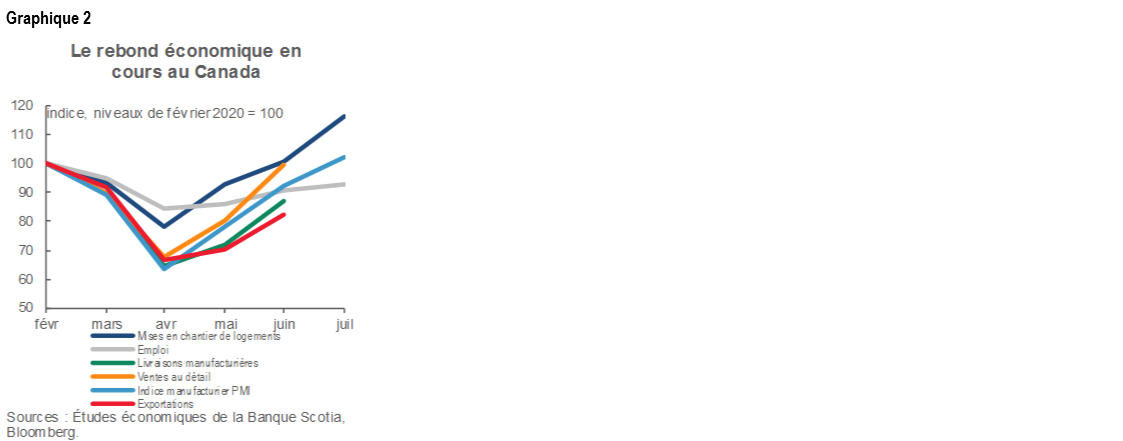 La reprise de la production industrielle euphorise aussi le rebond de la demande dans le transport des marchandises. En juin, les livraisons manufacturières sont restées en deçà des niveaux prépandémiques (selon les dernières données publiées); elles se sont toutefois accélérées depuis avril. Les exportations reprennent cette tendance (graphique 2). Le raffermissement soutenu du moral des entreprises devrait bien augurer de la reprise de l’offre, en particulier dans les industries qui sont plus facilement en mesure de s’adapter aux impératifs de la distanciation physique.