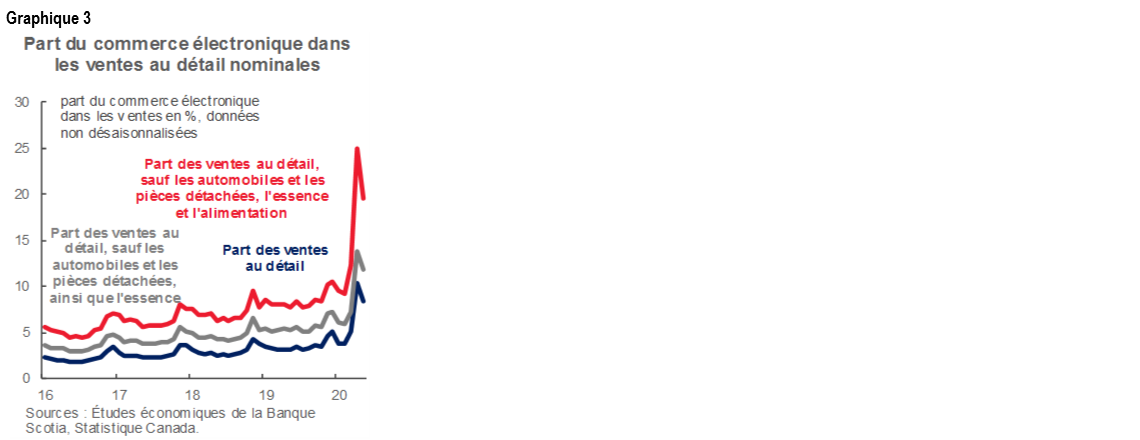 Le vigoureux rebond des ventes au détail augure très bien pour l’industrie du poids lourd. En fait, les ventes au détail de juin ont déjà dépassé les volumes d’avant la crise au Canada. Le basculement dans les achats en ligne pourrait éventuellement fortifier encore la demande de camions utilitaires. En pourcentage du total des ventes au détail, le commerce électronique a doublé durant la pandémie (pour passer de moins de 5 % à 10 % environ). En excluant l’automobile, l’essence et l’alimentation, ce bond est encore plus remarquable — puisque la part du commerce électronique est passée de moins de 10 % à près du quart de l’ensemble des ventes au détail en avril (graphique 3). On peut s’attendre à un repli, puisque les consommateurs se déconfinent de plus en plus; toutefois, il y aura probablement une mutation structurelle des habitudes de consommation à moyen terme.