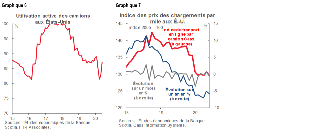 Ces tendances cadrent essentiellement avec les statistiques publiées sur le transport par camion aux États-Unis. Dans ce pays, les taux d’utilisation de la capacité des camions se sont rapprochés des niveaux prépandémiques jusqu’à la fin de juin, même s’ils ont à nouveau baissé par rapport aux pics de 2018 (graphique 6). Les prix (mesurés selon l’indice des prix Cass) ont perdu plus de 15 points de pourcentage juste avant la pandémie (graphique 7). Différents facteurs, dont essentiellement la suroffre de capacité, expliquent cette léthargie des prix puisque les commandes d’il y a un an ont été livrées dans un marché plus léthargique en 2019 et au début de 2020. Même si les prix ont encore dérapé en raison des fermetures induites par la pandémie, la baisse a été relativement discrète par rapport à la correction précédente.
