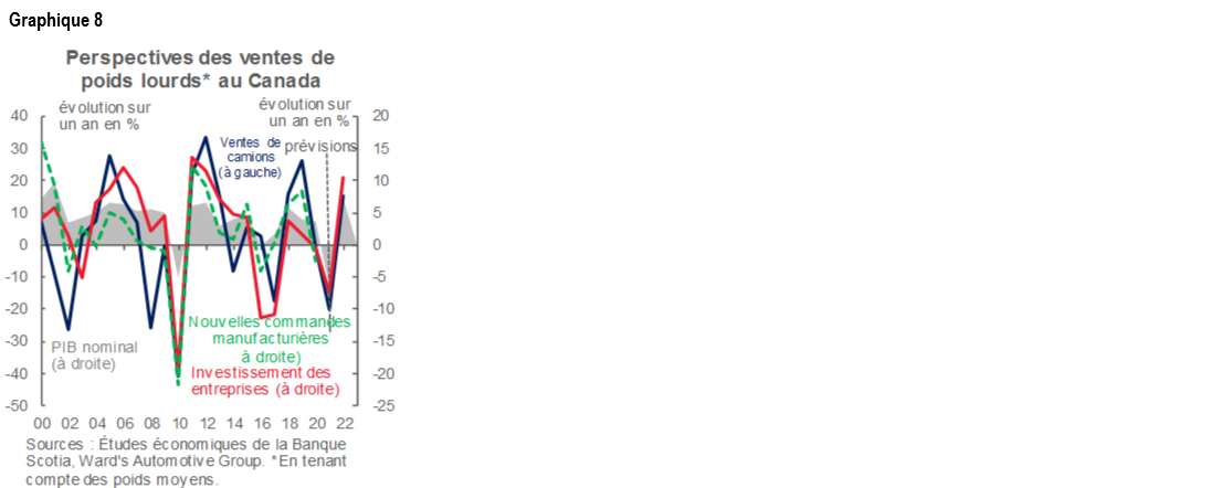 À moyen terme, la reprise économique devrait étayer la demande de transport de marchandises et, partant, les ventes de poids lourds. Autant les reculs sont spectaculaires dans l’industrie du camionnage, autant les rebonds peuvent être vifs. Les ventes ont rebondi de 22 % sur un an en 2010 dans la foulée de la crise financière mondiale, en dépassant leurs niveaux d’avant la crise en 2011. Ces cycles accentués rendent compte des fluctuations dans les tendances de l’évolution de l’investissement des entreprises, ce qui n’est guère étonnant, compte tenu des coûts élevés des acquisitions pour le capital (graphique 8). Il existe une corrélation comparable avec les nouvelles commandes manufacturières (et, plus généralement, avec d’autres indicateurs de la conjoncture commerciale). Les Études économiques de la Banque Scotia estiment à -7 % environ cette année la contraction de l’investissement des entreprises, avant d’enchaîner avec un rebond de l’ordre de 11 % en 2021, ce qui est comparable — voire en quelque sorte moindre — par rapport au recul de l’investissement pendant la crise financière mondiale.