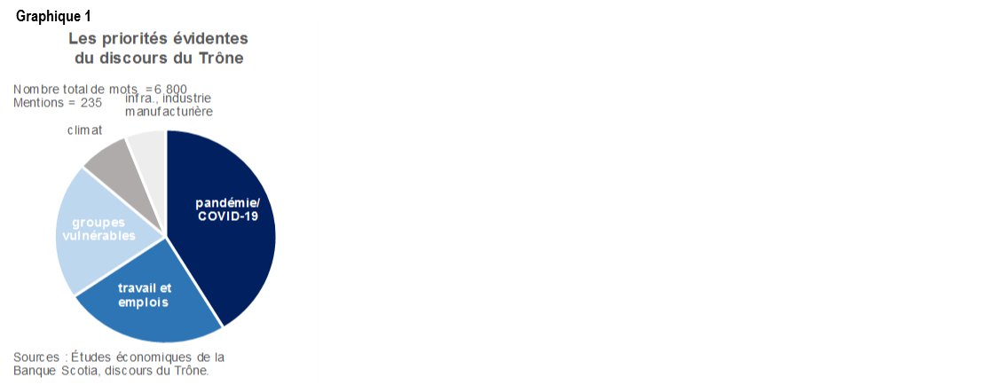La pandémie a été le thème cardinal de ce discours, en éclipsant largement le plan complet de la reprise économique. Il y a à peine quelques semaines, le premier ministre parlait d’une « ambitieuse reprise verte » et d’« audacieuses solutions nouvelles » pour l’économie canadienne. L’économie a basculé brusquement quand les collègues du cabinet se sont réunis la semaine dernière pour discuter du programme prospectif sur fond de recrudescence des cas de COVID-19 dans la plus grande partie du pays. Pour l’heure, la « toute première tâche » est toujours de poursuivre la bataille contre la pandémie et d’aider ceux et celles qui sont frappés de plein fouet (graphique 1).