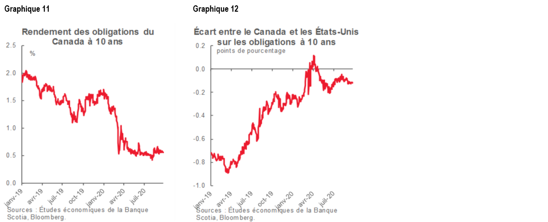 Le discours du Trône ne devrait pas avoir d’incidence considérable sur les marchés. On n’a guère relevé de signe d’un délestage sur les marchés obligataires ou monétaires canadiens dans la foulée immédiate du discours relativement à l’évolution de la conjoncture canadienne. Le gouvernement avait projeté un plus grand activisme budgétaire dans les semaines qui ont précédé l’événement qui a probablement contribué à une nouvelle tendance baissière des rendements et à un léger creusement des écarts par rapport aux États-Unis (graphiques 11 et 12). L’absence de détails concrets aujourd’hui a aussi probablement modéré toute réaction, puisque les marchés ont tendance à évoluer uniquement en réaction aux déclarations officielles importantes, alors que la politique laisse entendre qu’il n’y a pas eu d’impact discernable, à part de fortifier la tendance orientationnelle. Ce qui est tout aussi important, c’est que les résultats sont absorbés sur les mêmes marchés mondiaux que ceux qui traitent la recrudescence des cas de COVID-19 partout dans le monde, le discours de la Fed des États-Unis sur l’amenuisement des espoirs budgétaires, le risque électoral avivé aux États-Unis et le renouvellement de l’incertitude qui plane sur le Brexit.