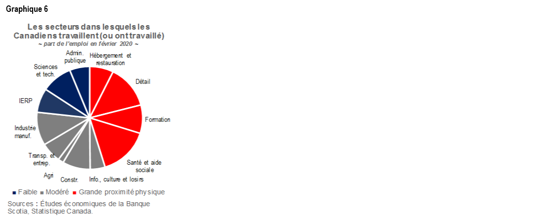 Dans le discours du Trône, le gouvernement reconnaît que la réactualisation des compétences et le recyclage doivent faire partie de l’intervention officielle dans la phase suivante de la reprise à plus forte raison si la deuxième vague vient creuser encore la divergence de la reprise de l’emploi parmi les différents secteurs. Puisqu’avant la pandémie, une quasi-majorité de la population active canadienne travaillait dans les secteurs jugés « difficiles », par Statistique Canada, pour la distanciation physique, certains Canadiens pourraient être aux prises avec un chômage prolongé (graphique 6). Il faudra attendre de prendre connaissance des détails d’un « investissement sans précédent » dans la formation professionnelle.