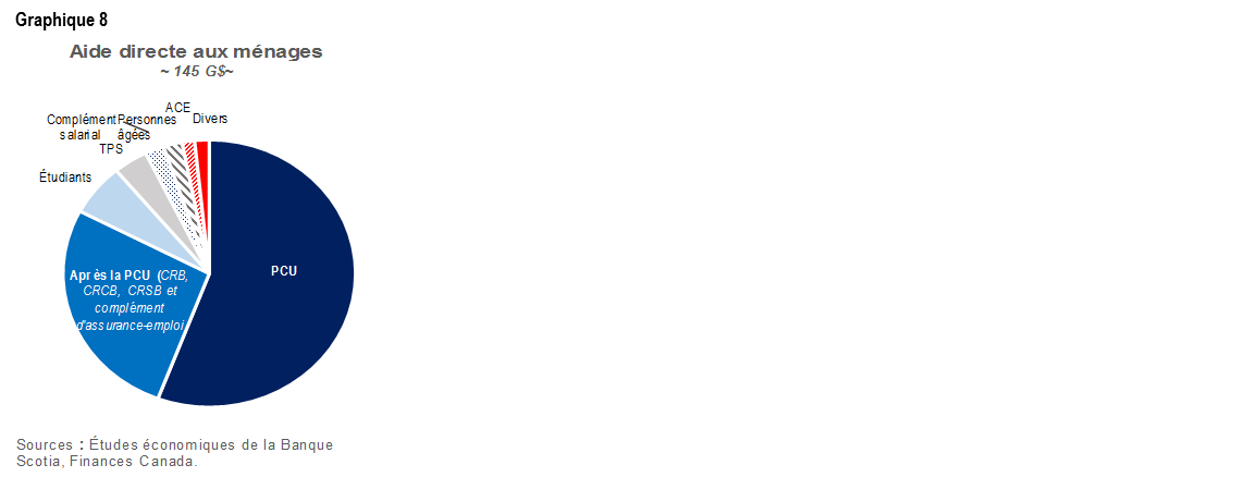Le mot d’ordre coutumier de la « classe moyenne » a été en quelque sorte mis en sourdine, mais est toujours présent. Il faut rappeler la série de baisses d’impôts sur le revenu de la « classe moyenne » dans les dernières années : ces baisses ont profité à la grande majorité des Canadiens (21 millions de Canadiens dans le dernier cycle, selon le DPB). À une époque plus récente, les mesures d’aide d’urgence destinées aux ménages au début de la pandémie n’ont été ciblées que généralement, compte tenu de l’impératif d’adresser des chèques aux ménages. Plus des trois quarts des 100 milliards de dollars de transferts et plus destinés aux ménages ont été versés grâce à la PCU par rapport aux transferts qui prévoient des critères de revenus plus rigoureux, notamment l’ACE, la TPS ou les versements d’appoint du SRG (graphique 8).