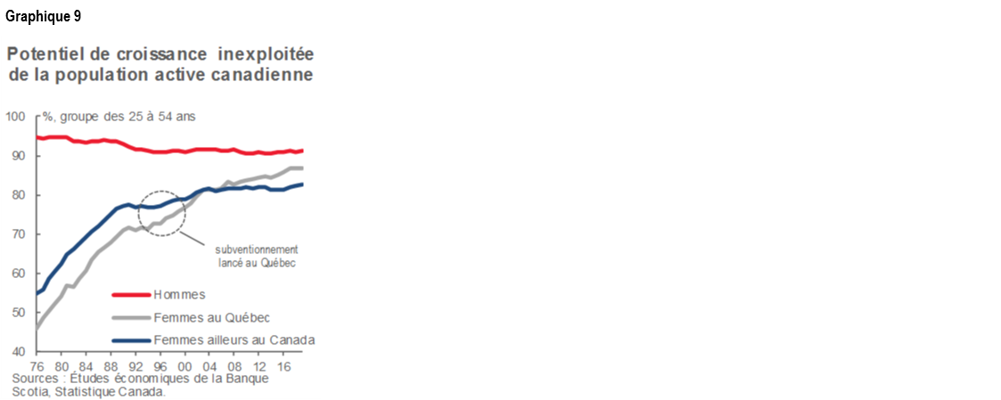 La garde des enfants est un complément souhaité dans les nouvelles priorités du gouvernement. Les chefs d’entreprises ont entre autres réclamé, en prévision du discours du Trône, un meilleur financement des services de garde d’enfants, ce qui a recadré la question du point de vue économique. L’expérience du Québec démontre que le régime universel peu coûteux pour la garde des enfants vient éliminer un obstacle de taille qui se dresse contre la participation à la population active pour bien des femmes (graphique 9), ce qui rapporte des dividendes économiques (et budgétaires). Ce régime peut aussi avoir pour effet d’accroître le revenu disponible des ménages et d’alléger indirectement les pressions qui pèsent sur l’abordabilité des logements. Le FMI estime qu’en haussant la participation des femmes à la population active du Canada pour le porter au même niveau que celui des hommes, on pourrait relever de 4 % le niveau du PIB du Canada à moyen terme.