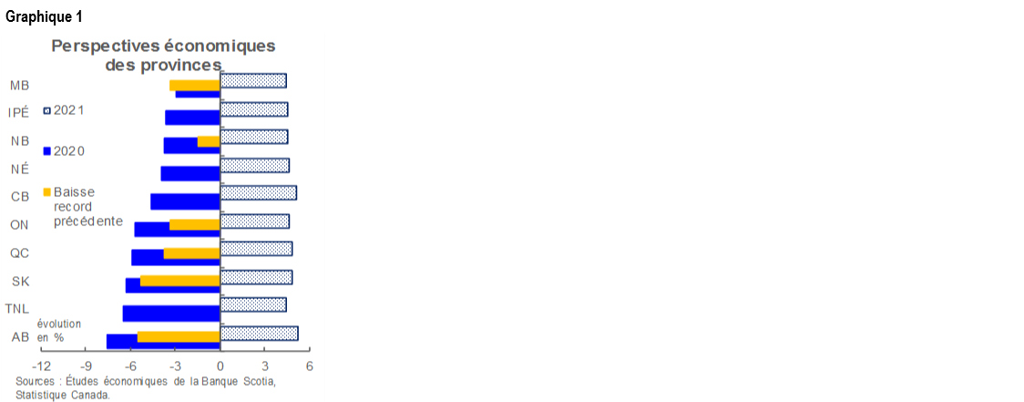 La COVID-19 devrait donner lieu à un affaissement économique sans précédent dans la plupart des économies provinciales du Canada. Malgré des progrès meilleurs qu’attendu dans le déconfinement le printemps dernier, la plupart des provinces constateront des contractions annuelles record cette année avant même de tenir compte des chocs potentiels de la deuxième vague sur l’activité économique.