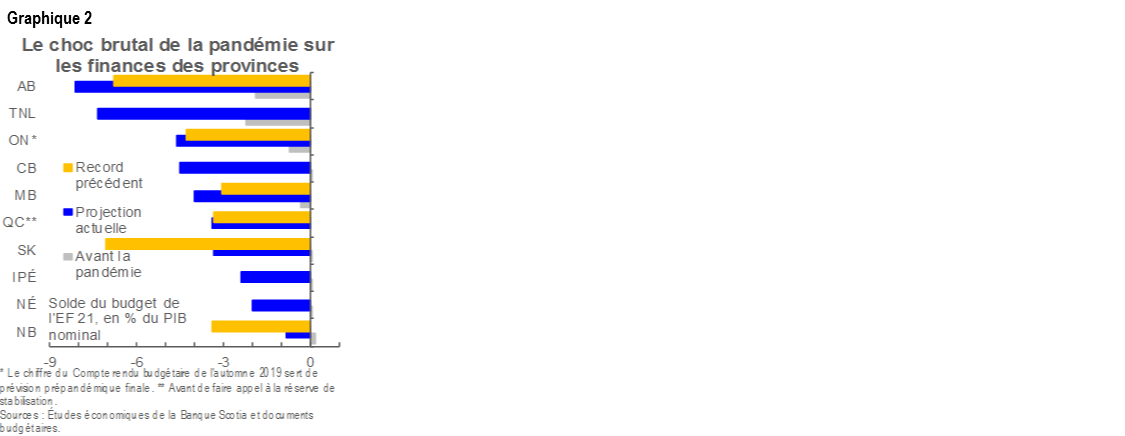 Dans l’ensemble, les recettes déprimées et les dépenses considérables donneront lieu, sans surprise, à des déficits sans précédent pour la moitié des gouvernements provinciaux dans l’EF 21 (graphique 2, page 1). Les dépenses déficitaires moyennes seront de l’ordre de 4,5 %, et il y aura quelques valeurs aberrantes liées à la dépendance vis-à-vis des ressources naturelles et à la prévalence de la pandémie. Si calamiteux que puissent paraître ces bilans, ils font piètre figure par rapport au déficit projeté actuel de 18 % du PIB nominal du gouvernement fédéral.
