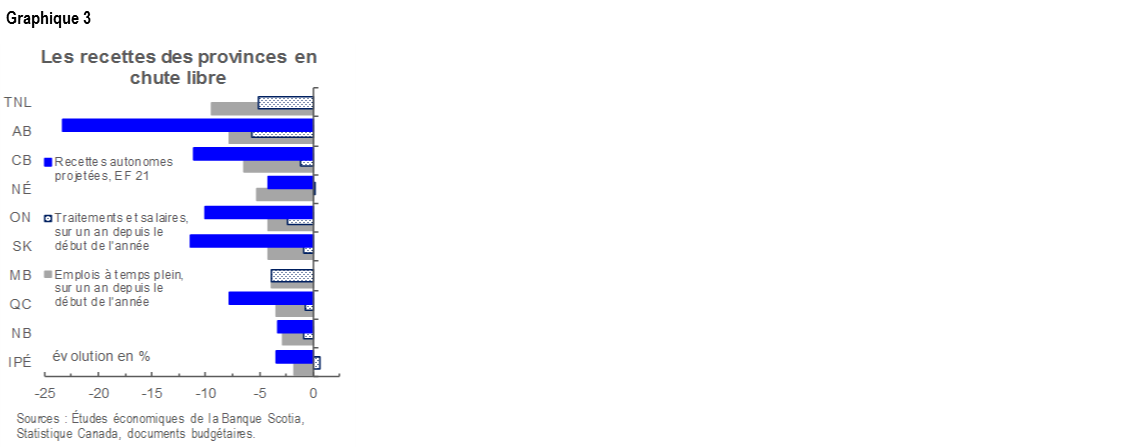 Les recettes autonomes devraient reculer de l’ordre de 11 %* dans l’ensemble des provinces durant l’EF 21, ce qui cadre avec les fortes pertes d’emploi et les baisses des revenus d’emploi (graphique 3). On s’attend essentiellement à ce que les recettes au titre de l’impôt des sociétés chutent avec le plongeon des bénéfices des entreprises. De concert avec les perspectives de la croissance économique, les provinces qui produisent plus de pétrole qu’elles n’en importent accuseront un autre coup dur quand les recettes sur les ressources naturelles dégringoleront. À nouveau, la situation est pire pour le gouvernement fédéral, puisque le Directeur parlementaire du budget (DPB) estime que les baisses de recettes seront supérieures à 15 % sur un an pour le gouvernement fédéral.