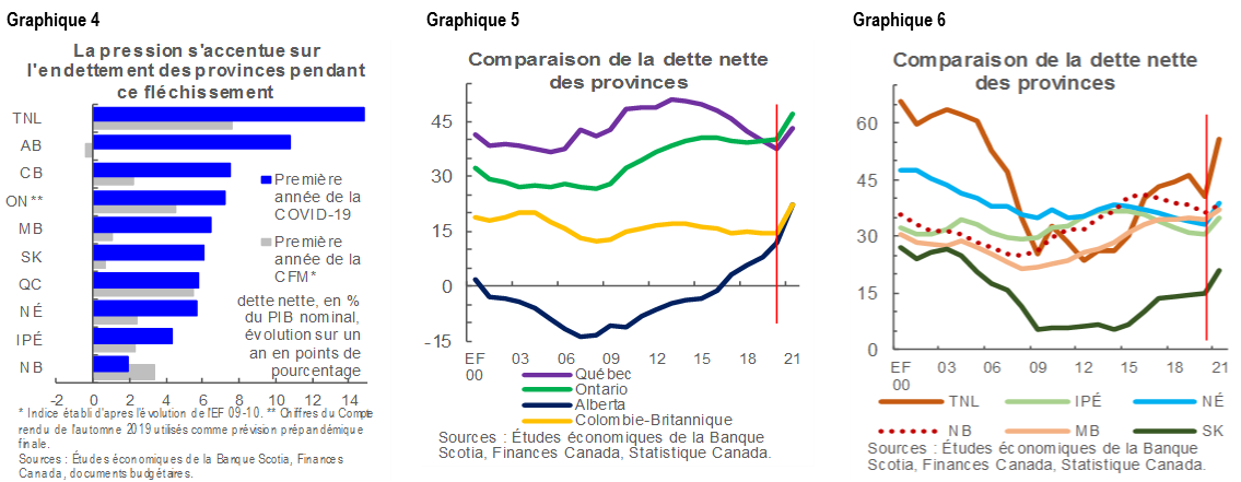 Il faut donc s’attendre à une évolution progressive des niveaux d’endettement dans l’ensemble des provinces. L’expansion des bilans de toutes les provinces devrait dépasser l’évolution de la dette du début de la crise financière mondiale de 2008-2009 (graphique 4). La plupart des provinces avaient adopté un parcours de consolidation de leur dette avant la pandémie — et certaines étaient plus avancées que d’autres — en raison de l’endettement élevé de certaines d’entre elles (graphique 5; graphique 6, page 3).