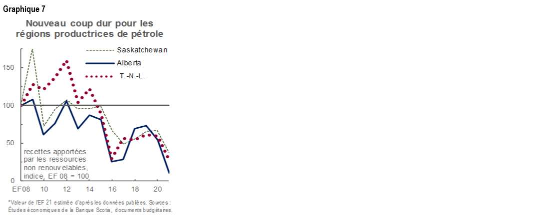 On s’attend à un rebond de la trésorerie des gouvernements dans l’EF 22. Les Études économiques de la Banque Scotia prévoient des rebonds économiques l’an prochain, de concert avec une légère remontée des cours du pétrole, ce qui ouvre la porte à une augmentation des recettes dans le prochain exercice budgétaire. Nous nous attendons toutefois à ce que l’activité économique — et, partant, les recettes des gouvernements — reste inférieure aux niveaux prépandémiques jusqu’en 2022. La perspective d’une reprise graduelle des cours du pétrole veut probablement dire que les gains des revenus de l’État au titre des ressources seront modestes, dans la foulée de la tendance baissière générale qui s’était amorcée durant la CFM (graphique 7).