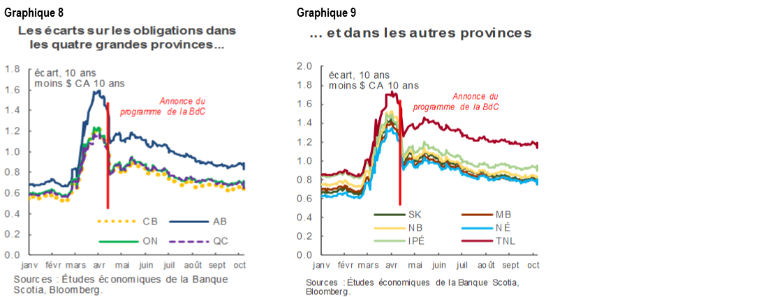 Les émissions supplémentaires de titres de dette des provinces ont été bien accueillies : plus des deux tiers des besoins (estimés à 154 G$) ont déjà été mobilisés. Après un pic initial de courte durée, les écarts sont par ailleurs restés proches des fourchettes normales, notamment en raison des rachats de la Banque du Canada, de concert avec les politiques relativement rigoureuses adoptées dans l’ensemble des provinces.