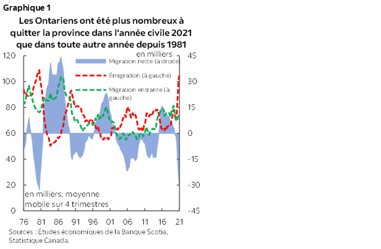 Publiées cet avant-midi, les données sur la population jusqu’à la fin de 2021 font toujours état d’un basculement marqué dans les villes que choisissent les Canadiens pour vivre et travailler. Ce qui attire surtout l’attention, c’est le rythme auquel d’anciens résidents partent de l’Ontario pour aller s’installer dans d’autres provinces et dans les territoires : en 2021, presque 108 000 personnes ont quitté la plus grande province du Canada — ce qui est sans précédent depuis l’année civile 1981 et ce qui contraste vivement avec la tendance d’avant la pandémie. Même si cet exode a été dominé par l’admission de 198 500 immigrants dans l’année civile 2021 — un record pour une période de quatre trimestres depuis au moins 1946 —, ce vaste mouvement à destination des autres provinces justifie un examen. Dans cette note, nous analysons les facteurs et les incidences de ce basculement.
