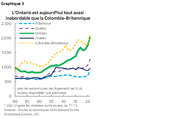 L’ampleur et l’étendue des destinations que recherchent les émigrants de l’Ontario s’expliquent aussi probablement par les difficultés qui se sont multipliées dans les dernières années du point de vue de l’abordabilité des logements, de concert avec la montée du télétravail. Récemment, Toronto a monopolisé l’actualité pour avoir dépassé Vancouver dans le palmarès des marchés du logement les plus chers au Canada. Ce qui est peut-être plus étonnant, c’est que l’an dernier, en pourcentage du revenu disponible, les prix de vente moyens des logements dans tout l’Ontario ont essentiellement cadré avec ceux de la Colombie‑Britannique pour la première fois depuis avant le début de la récession des années 1990 qui a percuté le secteur manufacturier du centre du Canada (graphique 3). Puisque le télétravail est aujourd’hui largement accepté sur le marché du travail canadien, il est logique de penser que certains travailleurs ontariens pourraient être attirés par les villes plus abordables — ce qui comprend désormais les basses terres continentales de la Colombie‑Britannique, auparavant beaucoup plus chères.