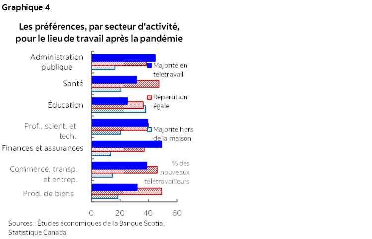 Il semble que ces deux facteurs soient probablement appelés à perdurer dans une certaine mesure. Nous estimons qu’en 2020, l’Ontario a comptabilisé le stock de logements résidentiels par personne le plus faible de toutes les provinces et qu’elle devrait construire 1,2 million de logements supplémentaires pour égaler le ratio des villes comparables à l’étranger. Nous présumons aussi que le télétravail se poursuivra sous une forme ou une autre au sortir de la pandémie et continuera d’influencer dans l’intervalle les tendances de la migration canadienne. Les résultats d’une récente enquête de Statistique Canada publiée en 2021 nous apprennent qu’une grande majorité de nouveaux télétravailleurs canadiens dans l’ensemble des provinces et dans la plupart des secteurs d’activité souhaitent continuer de télétravailler au moins pendant la moitié de leur emploi du temps (graphique 4). On pourrait logiquement s’attendre à ce que cette tendance diminue le poids des provinces plus chères comme l’Ontario.