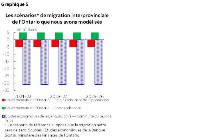 Pour estimer le poids économique potentiel associé à l’accroissement de la migration interprovinciale au départ de l’Ontario, nous avons fait appel à notre modèle économétrique trimestriel de l’économie de cette province et aux projections démographiques du gouvernement provincial. Dans nos prévisions normales, nous faisons appel aux prévisions de la population de référence de l’Ontario et nous rajustons l’historique lorsque les données sont publiées dans l’année; ainsi, les scénarios pensés par le gouvernement sont un excellent moyen d’évaluer les effets d’un ensemble d’exflux potentiels. En plus de modéliser le scénario de base de l’Ontario (migration interprovinciale nette de zéro au fil des ans), le parcours de faible croissance (migration nette moyenne annuelle de l’ordre de ‑5 000) et la trajectoire de forte croissance (+5 000 par an), nous mettons au point un scénario du pire, dans lequel la migration interprovinciale nette se poursuit au rythme de 2021, ce qui réduit d’environ 31 000 personnes par an jusqu’en 2025 la population de l’Ontario (graphique 5).