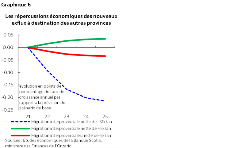 Notre modèle laisse entendre que notre « scénario du pire » ne viendrait pas modifier considérablement le cours de la croissance de l’Ontario dans les deux prochaines années. Nous estimons que des pertes nettes de 31 000 personnes par an ralentirait la croissance de l’Ontario de 0,2 point de pourcentage à peine par an1 jusqu’en 2025 — ce qui est un moindre choc dans le contexte de la croissance favorisée par le redéconfinement pandémique de 3 %-4 % que nous avions prévu pour 2022 et 2023 dans nos tableaux prévisionnels de mars 2022. Pourtant, cet attrait serait plus important quand l’économie convergera vers un taux de croissance potentiel à long terme inférieur à 2 %. Les incidences sont plus modestes pour la migration interprovinciale nette de ±5 000 personnes par an (graphique 6). Il ne s’agit pas d’un résultat tout à fait inattendu, puisque l’immigration internationale nette — qui ne change pas dans tous les chocs de notre modèle — représente au moins 72 % de la croissance annuelle de la population dans chacune des années des scénarios démographiques de l’Ontario.