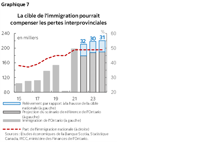 Dans tous les cas, le relèvement des cibles de l’immigration nationale — ainsi que la hausse apparente du poids de l’Ontario pour les nouveaux arrivants — pourrait compenser les pertes démographiques interprovinciales selon le « scénario du pire ». Depuis le début de la pandémie, l’admission des nouveaux arrivants a été dominée par les résidents temporaires déjà installés au Canada et titulaires du statut de résident permanent. Dans cette période, l’Ontario a constaté que sa part dans l’immigration nationale a augmenté pour passer de 45 % en 2019 à 49 % en 2021; toutefois, avant même la COVID-19, cette part de 45 % représentait une nette hausse par rapport aux taux dans la forte trentaine au milieu des années 2010. Si les cibles annoncées récemment dans l’admission des immigrants à l’échelle nationale sont atteintes et que l’Ontario maintient sa part de 49 % dans le nombre d’immigrants admis, elle accueillerait environ 30 000 immigrants de plus par an que prévu dans son scénario démographique de référence dans la période de 2022-2025 (graphique 7), ce qui compenserait même les pertes interprovinciales nettes de 31 000 personnes par an dans notre scénario du pire.