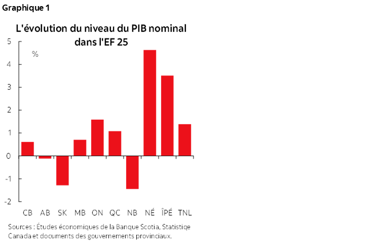 - Le PIB nominal est aussi ressorti à la hausse par rapport aux précédentes prévisions pour la plupart des provinces, surtout la Nouvelle-Écosse et l’Île-du-Prince-Édouard, qui ont inscrit des progrès de plus de 3 % (graphique 1) par rapport aux niveaux de 2024 retenus en hypothèse dans leurs budgets de 2025 et dans les Comptes publics de 2024-2025.