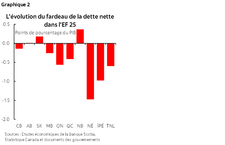 - Le Nouveau-Brunswick et la Saskatchewan ont constaté des hausses dans l’estimation du fardeau de leur dette, même si ces provinces continuent de supporter des fardeaux d’endettement inférieurs à ceux des provinces comparables (tableau 2).
