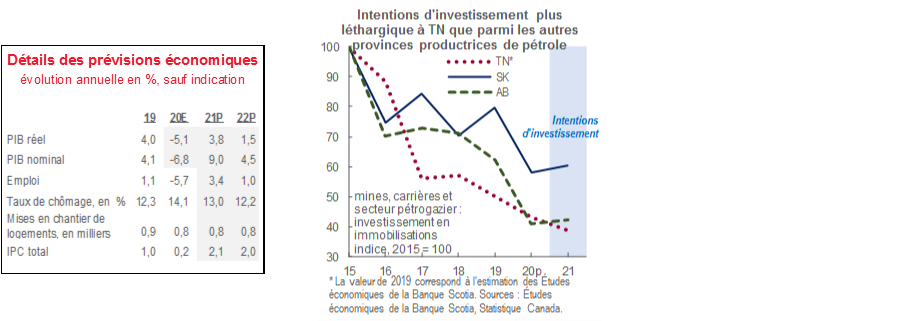 En 2021, nous prévoyons un solide rebond, qui sera toutefois moins prononcé que dans d’autres provinces. Même si la situation s’est apaisée, le début de l’année 2021 a été lent à cause de la deuxième grande vague pandémique, qui a donné lieu à de fortes restrictions dans le confinement. Les valeurs du brut, qui ont commencé 2021 en lion, pourraient ne pas donner tout de suite lieu à des gains dans l’investissement et dans l’emploi, puisque le secteur de l’énergie est en train de basculer dans les grands projets dont les délais d’exécution sont prolongés. Les intentions d’investissement anémiques de Terre-Neuve-et-Labrador par rapport aux autres provinces productrices de pétrole paraissent confirmer ce fait (graphique). À ce sujet, le gouvernement s’est engagé à financer le projet d’agrandissement de West White Rose — essentiel pour la production à long terme du gisement pétrolifère en mer éponyme; or, les travaux sont retardés au moins jusqu’en 2022. Les opérations du gisement Terra Nova restent suspendues malgré l’aide apportée par le gouvernement provincial.