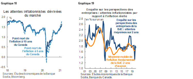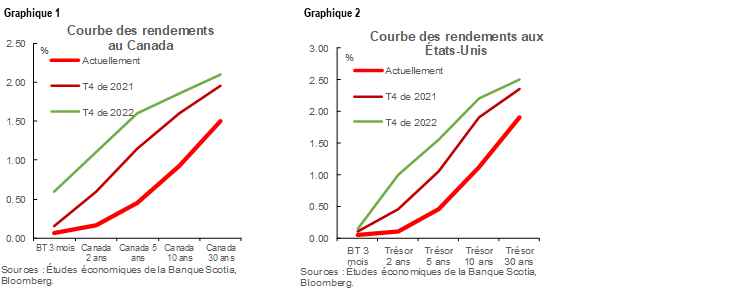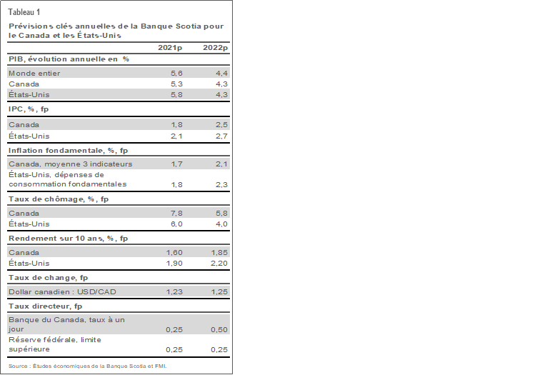 Si jamais les deux banques centrales devaient atteindre leurs objectifs inflationnistes — en plus du plein-emploi pour la Fed dans le cadre de son double mandat —, il se pourrait que les conditions soient, depuis bien des années, les plus propices pour y arriver en raison des vaccins, de la reprise de la demande, du surciblage massif des mesures de relance et de l’offre plus restreinte qu’auparavant dans l’équilibre économique. Ainsi, le rendement des bons du Trésor américain à 10 ans se hisserait à 1,9 % d’ici la fin de l’année, et le rendement des obligations du Canada à 10 ans ferait un peu mieux.