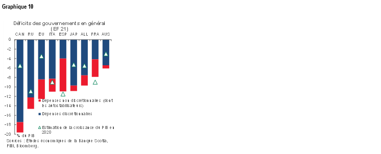 Certaines mesures de relance américaines se répercuteront sur le Canada dans le compte commercial et représentent des mesures de relance indirectes. En outre, la modeste « vague bleue » qui déferle à Washington aura probablement des effets d’entraînement sur un parti pris comparable au Canada. Le désendettement de l’État dans les grandes puissances économiques pourrait céder la place à un ciblage timide de ratios aplanis de la dette de l’État par rapport au PIB, qui se situent toujours à des niveaux très élevés à long terme (graphique 10).