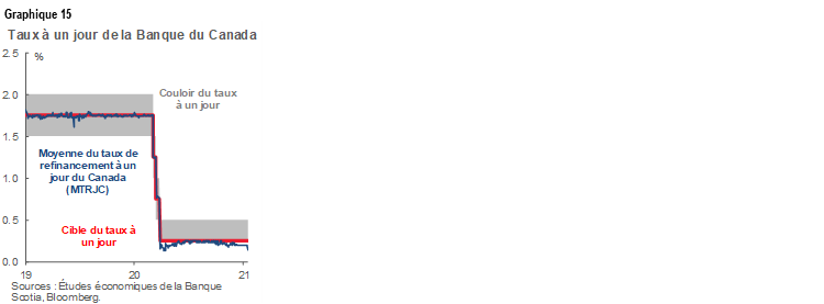 Nous prévoyons que le bilan de la Banque du Canada atteindra bientôt un point culminant, qu’il se comprimera au T2, puis qu’il se stabilisera pendant un temps avant de baisser graduellement en 2022. Les dépôts des participants du système de transfert de paiements de grande valeur auprès de la Banque du Canada devraient suivre une trajectoire essentiellement comparable à celle de l’ensemble des actifs de la BdC. Selon les prévisions, les dépôts du système de transfert de paiements de grande valeur devraient commencer à fléchir peu avant de se stabiliser durant l’année et recommencer à baisser pendant toute la durée de 2022. Il s’agira de la première étape du durcissement de la politique monétaire : il y aura moins de liquidités dans le système financier, ce qui pourrait amoindrir les distorsions qui fragiliseront les taux du marché par rapport au taux directeur de la BdC.