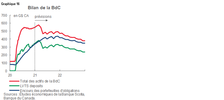 Le portefeuille global des obligations de la BdC ne commencera probablement pas à baisser avant l’an prochain. En plus du débouclage des rachats d’obligations du GdC de la BdC, nous supposons que le Programme de rachat d’obligations provinciales pourrait ne pas s’étendre au-delà de mai — ou s’il l’est, n’être prorogé que pendant quelques mois — et que le débouclage du Programme de rachat d’obligations hypothécaires du Canada à la fin d’octobre aura pour effet de comprimer lentement les portefeuilles selon la maturation des titres et que le portefeuille des obligations de sociétés restera négligeable. C’est cette deuxième étape du débouclage de 2021, suivie d’une compression pure et simple du portefeuille d’obligations en 2022, qui aura pour effet de ralentir les efforts consacrés par la politique monétaire pour veiller à ce que les rendements obligataires à plus long terme restent faibles.