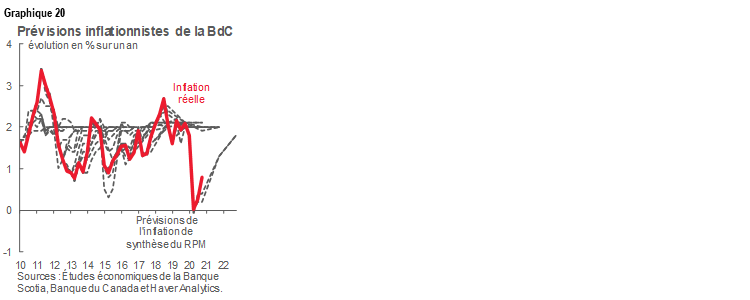 Sur cette toile de fond macroéconomique exposée ci-dessus, l’inflation n’a jamais eu de meilleure chance d’émerger. Le président de la Fed, Jerome Powell, fait à juste titre observer que la relation de la courbe de Phillips entre l’inflation et le chômage est plus plane aujourd’hui qu’elle ne l’a jamais été dans les annales et que l’inflation n’est guère récalcitrante. Il fait valoir que l’évolution de la démographie, les perfectionnements de la technologie et la mondialisation sont les principales raisons qui justifient ces deux observations. Et même si on s’en tenait à ces arguments, les facteurs évoqués par M. Powell pourraient moins peser sur l’inflation à terme. D’une part, la mondialisation a subi, à cause des guerres commerciales, des contrecoups qui ne devraient pas s’infléchir bientôt, selon nos prévisions. D’autre part, les entreprises numériques pourraient exercer un pouvoir de tarification pendant la pandémie et ainsi maîtriser les effets désinflationnistes de la technologie. En outre, le vieillissement de la population s’accompagne désormais d’une politique d’immigration plus restrictive aux États-Unis avant la pandémie, ainsi que de déficits d’immigration en 2020 et probablement encore pendant un certain temps au Canada comme aux États-Unis.