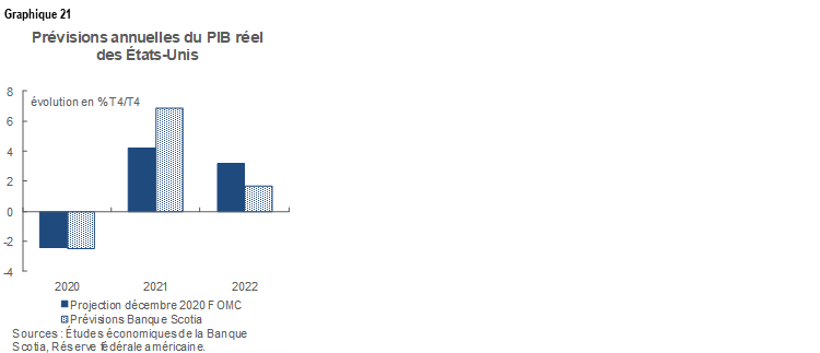 L’on s’attend à ce que la Réserve fédérale durcisse sa politique par étapes à partir du deuxième semestre de 2021. Les effets, qui devraient être disruptifs pour les marchés, pourraient toutefois être atténués par rapport à ce qui s’est produit en 2013-2014, du moins pour le marché obligataire. On a déjà discuté des facteurs fondamentaux, qui devraient amener le FOMC à réviser à la hausse sa projection de croissance cette année par rapport aux prévisions de décembre, qui ne tenaient pas parfaitement compte des effets de la politique budgétaire et des vaccins (graphique 21).