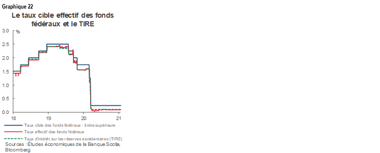 Chemin faisant, il se pourrait que l’écart s’amoindrisse, par rapport aux niveaux actuels, entre le taux cible des fonds fédéraux et le taux d’intérêt sur les réserves excédentaires (graphique 22).