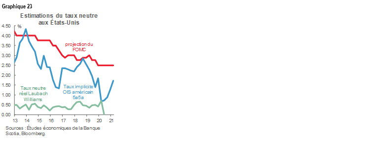 Ainsi, quand la pandémie a amené la Banque du Canada à réduire encore de 50 points de base, à 1,75 %-2,75 %, avec un point médian de 2,25 % (veuillez cliquer sur ce lien), son taux neutre estimatif, elle a télégraphié son intention d’avancer à pas feutrés. Les mises au point de la politique monétaire ne doivent pas se dérouler en ligne droite, et il est improbable qu’elles permettent de revenir précipitamment au taux neutre. Il se peut que la BdC croie que le taux neutre s’établit à un niveau plus proche de la moitié inférieure de la fourchette monétaire de 1,75 %-2,25 %, d’après les prévisions similaires du Conseil de direction de la BdC dans les années qui ont précédé la pandémie. À l’heure actuelle, les marchés croient que le taux neutre se situe dans le creux de la fourchette de la BdC (graphique 17). Dans ce cas, le chiffre de 2 % serait probablement celui qui correspond à peu près à la définition que donne la BdC au taux neutre. Autrement dit, une marge d’environ 175 points de base dans le durcissement de la politique n’est plus stimulante.