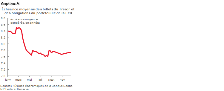 Un autre moyen sur lequel la Fed pourrait se pencher dans le contrôle des effets du débouclage sur les marchés pourrait consister à étendre la maturité moyenne pondérée de ses rachats (graphique 24). « Presque tous » les membres du FOMC se sont opposés au prolongement de la maturité moyenne pondérée des rachats d’obligations à la réunion de décembre — comme l’avait fait la BdC à sa réunion d’octobre — et ils sont probablement du même avis aujourd’hui, compte tenu des facteurs vigoureux qui portent depuis la légère hausse supplémentaire des rendements des bons du Trésor. Si le FOMC juge que ces facteurs continuent d’être sains, il se pourrait alors qu’il soit improbable que ce comité décide de prolonger la maturité moyenne pondérée, en gardant cette solution comme option si la volatilité des marchés devait flamber.