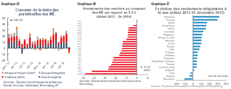 Il faut se rappeler qu’en 2013, le coup de sang initial a donné lieu à un retrait massif des courants de portefeuille sur les marchés émergents (graphique 25). Cette affirmation se vérifiait pour les actions comme pour les obligations. Le deuxième cycle de l’intervention a continué d’offrir des courants de capitaux; or, le marché a réclamé un rendement constamment supérieur, ce qui a fait brusquement baisser de nombreuses monnaies en 2013-2014 (graphique 26). Ce n’était pas seulement le cas des marchés émergents non plus, puisque d’autres monnaies à bêta supérieur ont fléchi — par exemple le dollar canadien, qui a perdu plus de 12 cents entre le début de 2013 et le début de 2014. La revalorisation des cours des bons du Trésor américain à 10 ans et l’exode des capitaux sur les marchés émergents ont aussi fait brusquement monter leurs rendements obligataires (graphique 27).