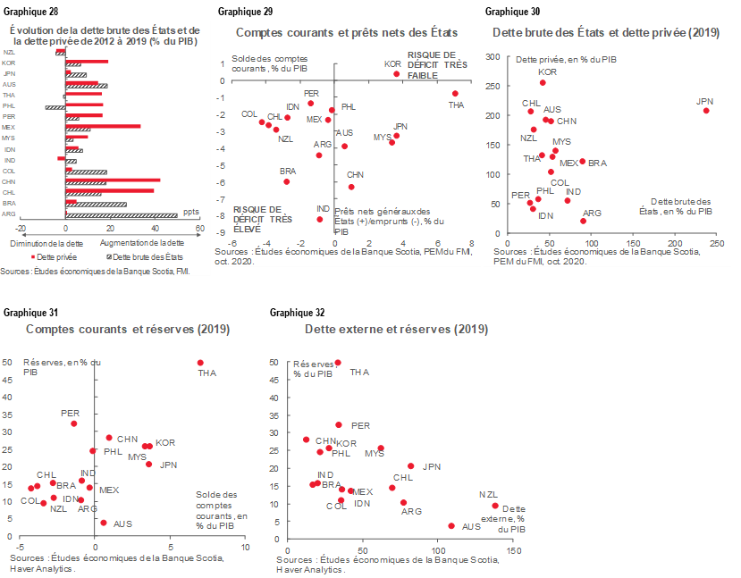 Il se peut que les marchés émergents soient plus vulnérables à l’exode des capitaux; le graphique 28 indique en partie que l’on s’attend à des rendements supérieurs et précise l’importance de la hausse des titres de dette du secteur privé et de l’État entre la veille du coup de sang de 2013 et la veille de la pandémie. Les graphiques 29 à 32 illustrent l’importance de ne pas traiter les marchés émergents comme grande catégorie d’actifs, au lieu de disséquer les perspectives selon le principe de la différenciation; ces graphiques font état des énormes différences parmi les indicateurs comme la dette externe, les réserves et les soldes du compte courant. Le débouclage du bilan de la Fed, qui a privé les marchés émergents d’une couverture de sécurité, a mis en branle un cycle de difficultés en levant le voile sur ce qui nous guettait et a donc servi de catalyseur pour de plus grandes difficultés.