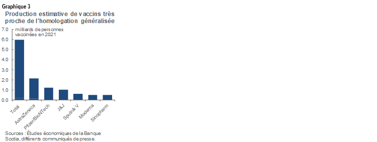 On produire cette année environ 9,2 milliards de doses de vaccin contre la COVID-19, d’après les prévisions de trois pharmaceutiques occidentales, d’une entreprise russe et d’une société chinoise, pour la période comprise entre la fin de l’année écoulée et la fin de la nouvelle année. Ces doses seront suffisantes pour vacciner environ 5,8 milliards de personnes, à des rythmes qui varient légèrement (graphique 3), soit à peu près les trois quarts de la population mondiale totale. De nombreux autres vaccins candidats pourraient éventuellement être mis au point, ce qui pourrait finalement hausser la population vaccinée. À mesure que d’autres pactes de production seront conclus, l’année pourrait s’achever sur un écart proche de l’immunité collective mondiale, établie à un seuil de 70 %. Bien des pays, dont le Canada et les États-Unis, pourraient bien, individuellement, franchir cette étape.
