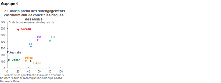 Le discours qui s’est donné libre cours durant certains trimestres et selon lequel le déploiement des vaccins est un échec est faux de toute évidence. Les vaccins ont été livrés dans le délai d’au moins 6 à 12 mois avant les hypothèses courantes juste avant que l’on commence à annoncer les résultats positifs des essais en novembre 2020. Les plans actuels de déploiement laissent entendre que la population canadienne sera entièrement vaccinée au cours du S2 de 2021. Les attentes ont mué quand la barre a été relevée, ce qui est compréhensible, compte tenu de l’impératif des difficultés à résoudre; or, les progrès sont beaucoup plus impressionnants que ce que laissent entendre les reportages opportunistes. En fait, à l’heure où l’on rattrape les retards passagers dans la livraison des vaccins, le Canada a la position la plus avantageuse, grâce au nombre relativement moindre de cas par habitant et à une population vaccinée nettement supérieure grâce aux commandes de production, alors que les États-Unis ont plus de cas, mais se situent aussi au-dessus de la moyenne dans la sécurisation des contrats de livraison de vaccins (graphique 4).