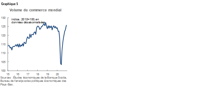 Il y a une plus grande marge de manœuvre dans la reprise du commerce mondial depuis les creux induits par les fermetures du début de l’année (graphique 5). Les guerres commerciales mondiales menées par les États-Unis, qui ont fait plonger le commerce et qui ont rehaussé l’incertitude pourraient se calmer dans un contexte de politiques un peu plus favorables sous la nouvelle administration américaine.