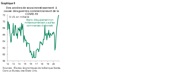 Peu à peu, on devrait exprimer une préférence plus forte pour les biens d’équipement, lorsque la capacité excédentaire sera réabsorbée et que les besoins en technologies augmenteront dans la foulée des années de sous-investissement (graphique 6).